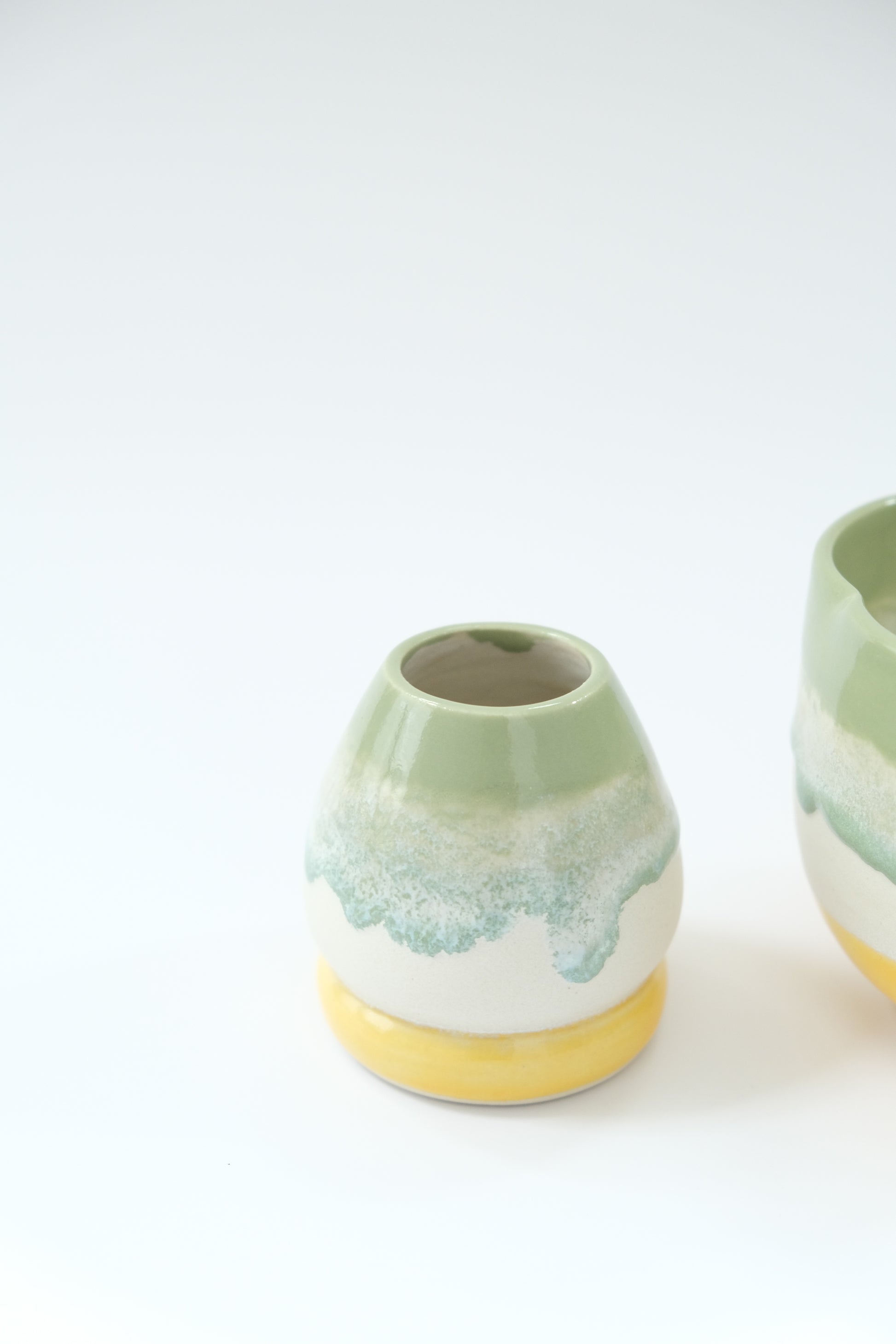 A matcha set glazed in a satin milky cream base, layered with matcha green and golden yellow glazes to create a blending, melting effect. Please note that due to the hand-layered process, the placement of the colors and drips may vary slightly from bowl to bowl.